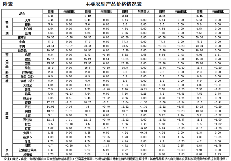 沈阳市重要生活必需品市场监测情况专报(3月15日)