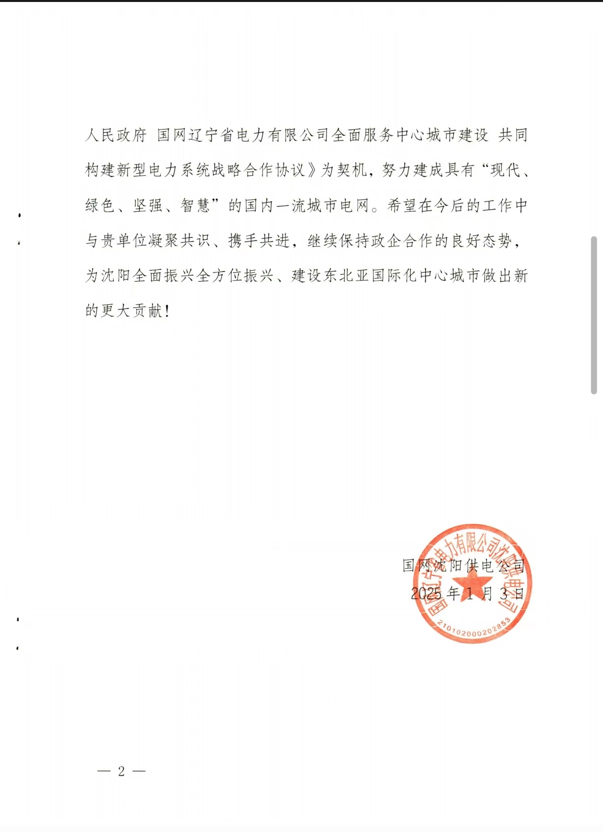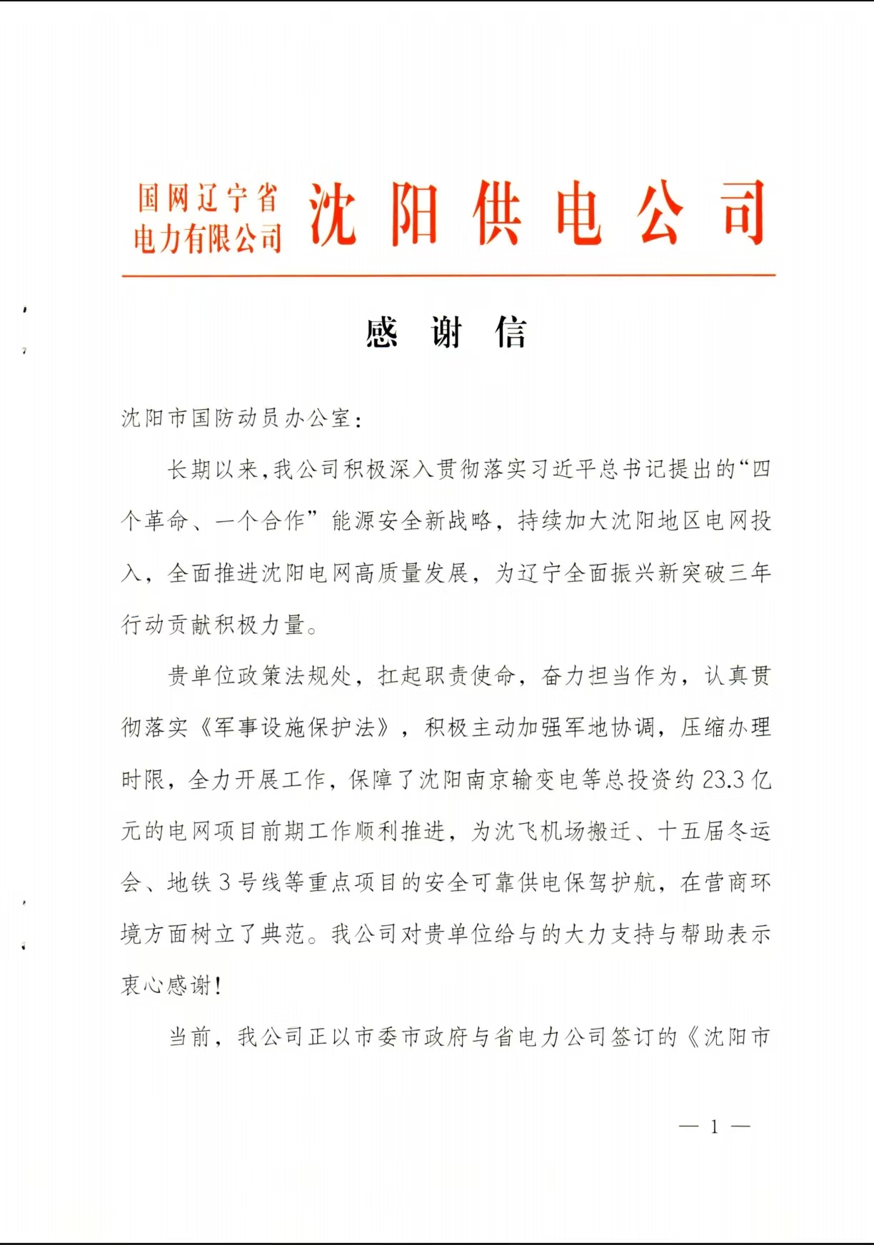 2025年1月3日,国网沈阳供电公司的2位同志带着一面锦旗和一封感谢信来到沈阳市国防动员办公室,他们此行是为了感谢沈阳市国动办政策法规处的同志为他们在保障沈阳南京输变电等重点电网项目顺利推进中,充分发挥党员先锋带头作用,勇于担当作为,压缩办理时限,为重点供电项目保驾护航,在营商环境方面树立了典范,推进沈阳电网高质量发殿中给予了大力支持和帮助表示衷心感谢。